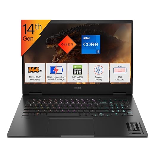 HP OMEN Gaming, New Laptop 14th Gen Intel Core i7-14650HX, 8GB RTX 4060 (16GB DDR5, 1TB SSD) FHD, 144Hz, IPS, 16.1-inch (40.9 cm) Win11, Office21, Black, 2.39 kg, AE0002TX , RGB KB, Tempest Cooling Gaming Laptop